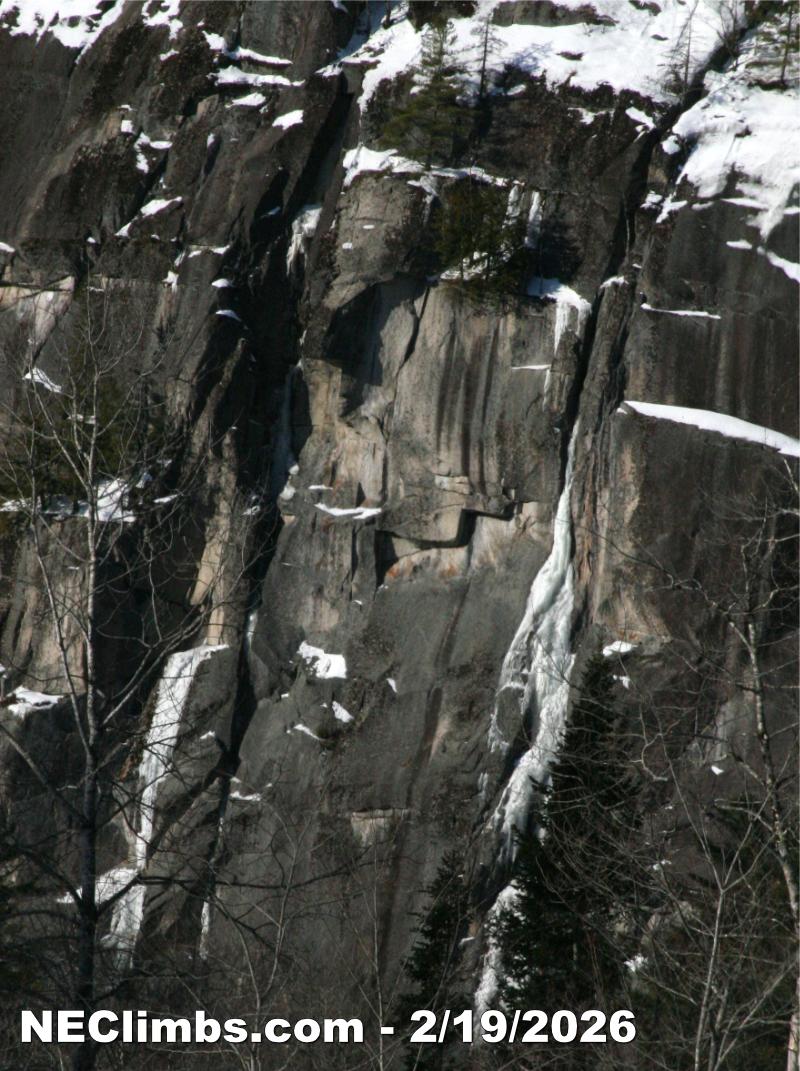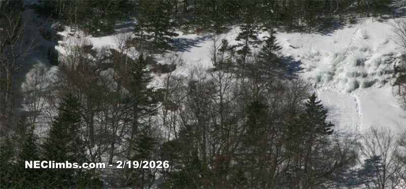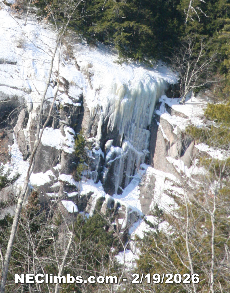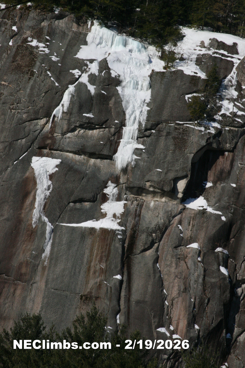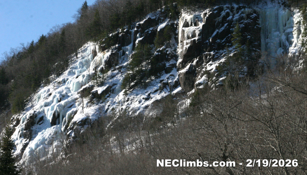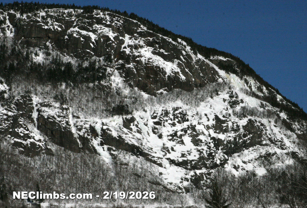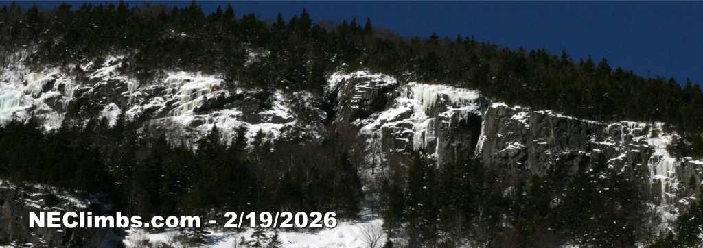 Just as you would expect following Ice Fest AND a week of truly balmy temps, going to be upper 30's today, the ice can be a mixed bag. I saw someone post about how things are terrible. But digging into it, I realized they were talking about places like the North End that are very well used. It probably gets the most use of all. There are only a few places that have really easy access to moderate climbing and where you can set up a bunch of top-ropes. So that's not unexpected. And of course the climbs that are getting a lot of full sun are getting somewhat punked-out. On my way back from Wolfeboro mid-afternoon a few days ago I took a look at Rainbow Slabs which look as if they are getting pretty funky. And I watched a hunk of the bottom of Way In The Wilderness fall down! IMO it's really the time to start paying attention to what you're walking underneath, any time of the day. Enjoy this weather, but keep paying attention...