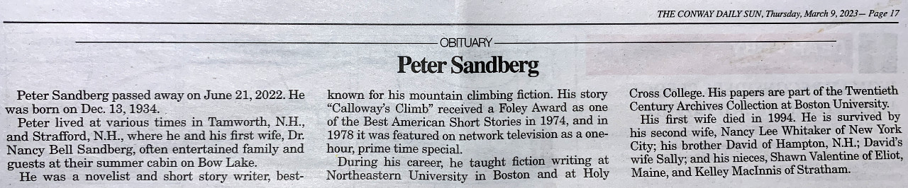 I spotted this in last week's newspaper. I was turned on to Peter by George Hurley. George and Jean published a book of short climbing stories by Peter that are very well done. The book is entitled GABE'S FALL AND OTHER CLIMBING STORIES. I highly recommend it, if you can find it. RIP Peter...