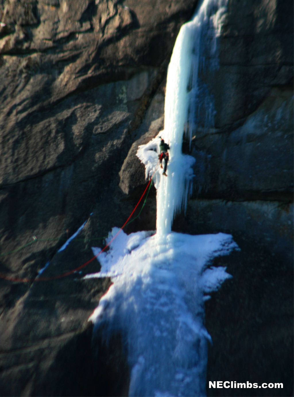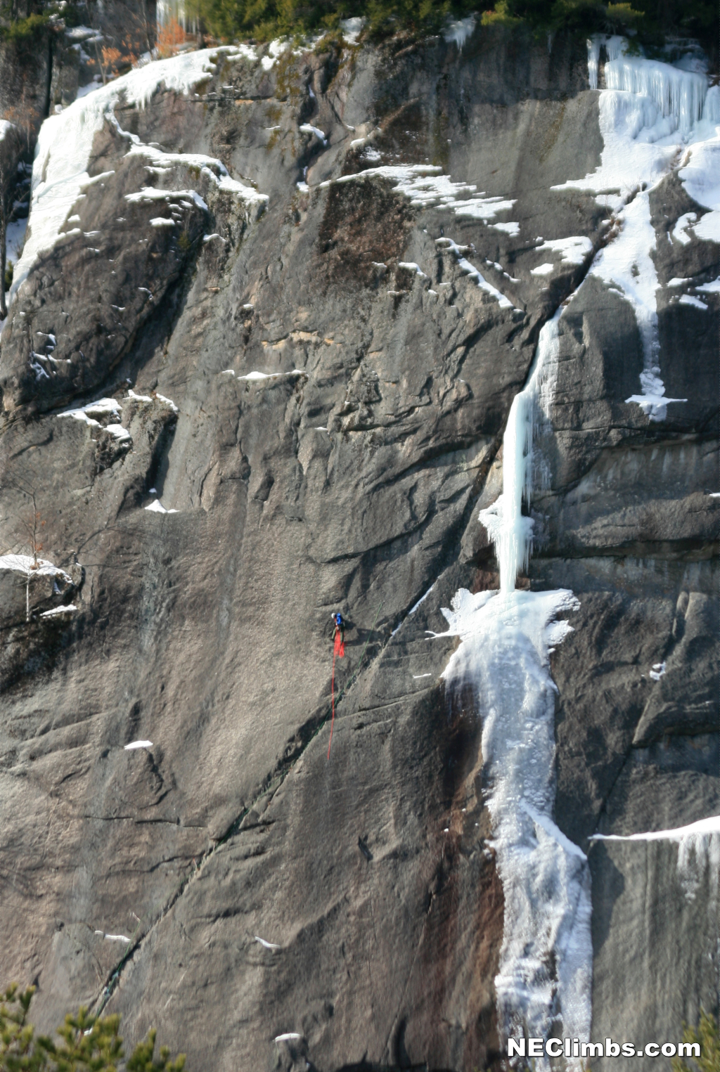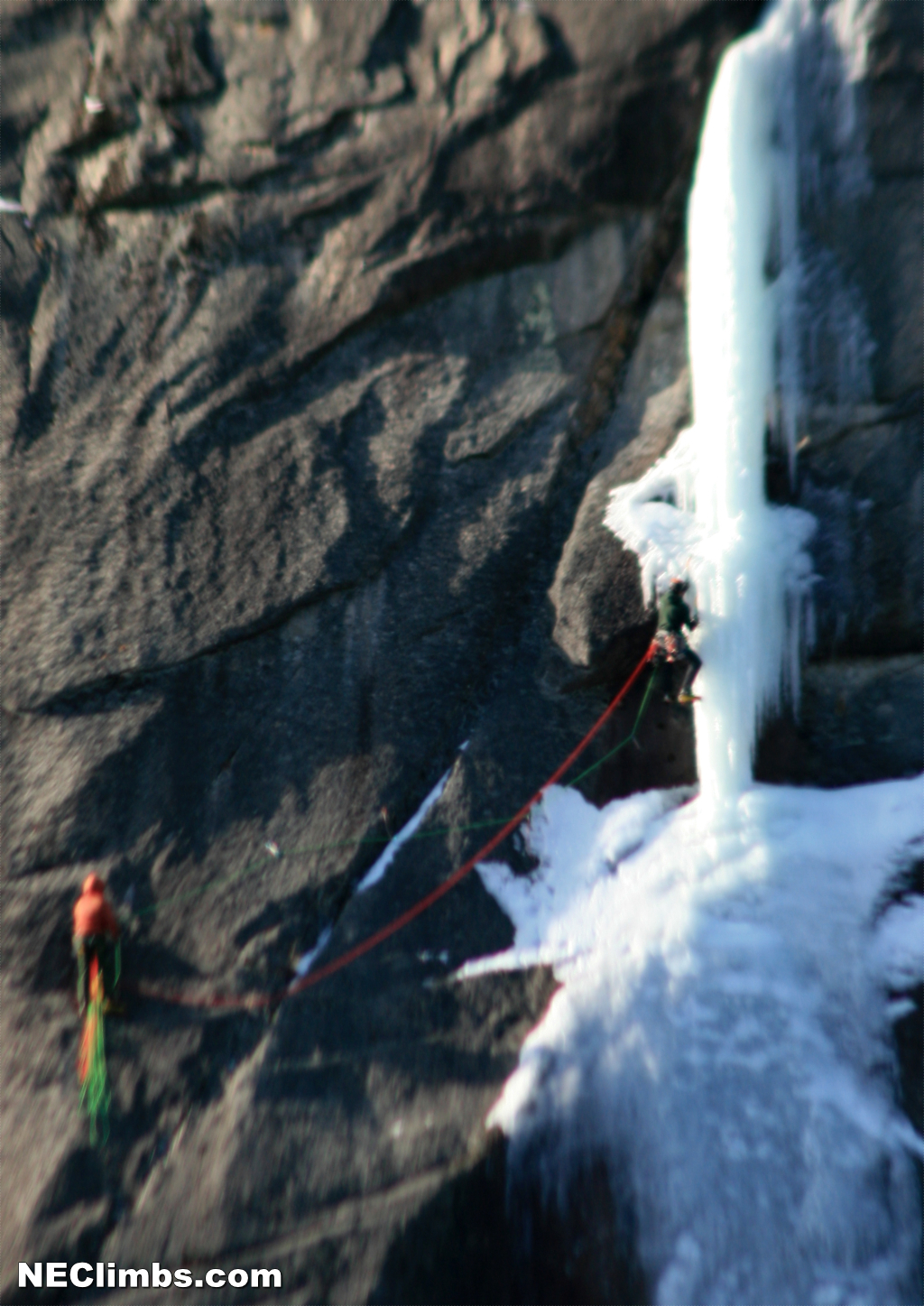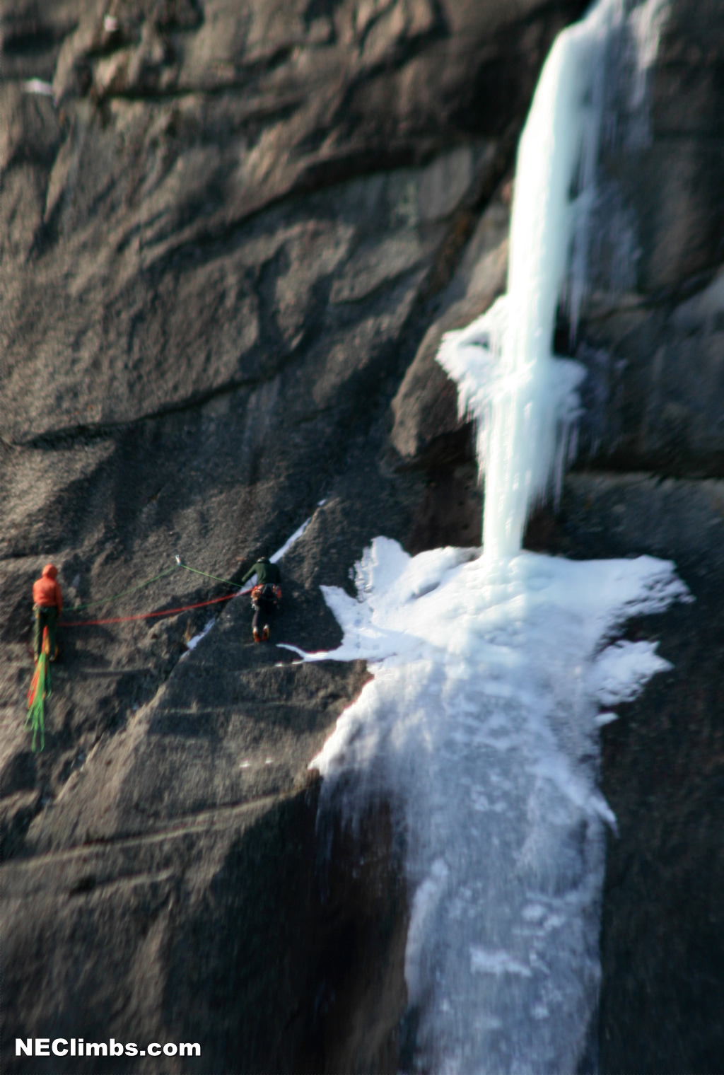 Amazingly enough, through all of this warmth, much of the ice hung in. That is most certainly due to the very cold December. Many things formed fairly well, and even now we had some nights that were cold enough to help rebuild the climbs that were somewhat fat. A good example is Diagonal. The wall was almost clear after the last big rain, but started building again during a cold snap right afterward. Enough that it attracted the attention of Peter Doucette and Ryan Driscoll! I was on my way home from an early gym session Tuesday morning and just noticed that there was someone on the dike! Knowing full well what was going on, I rushed home and grabbed the big camera and took a series of pictures over the next hour.