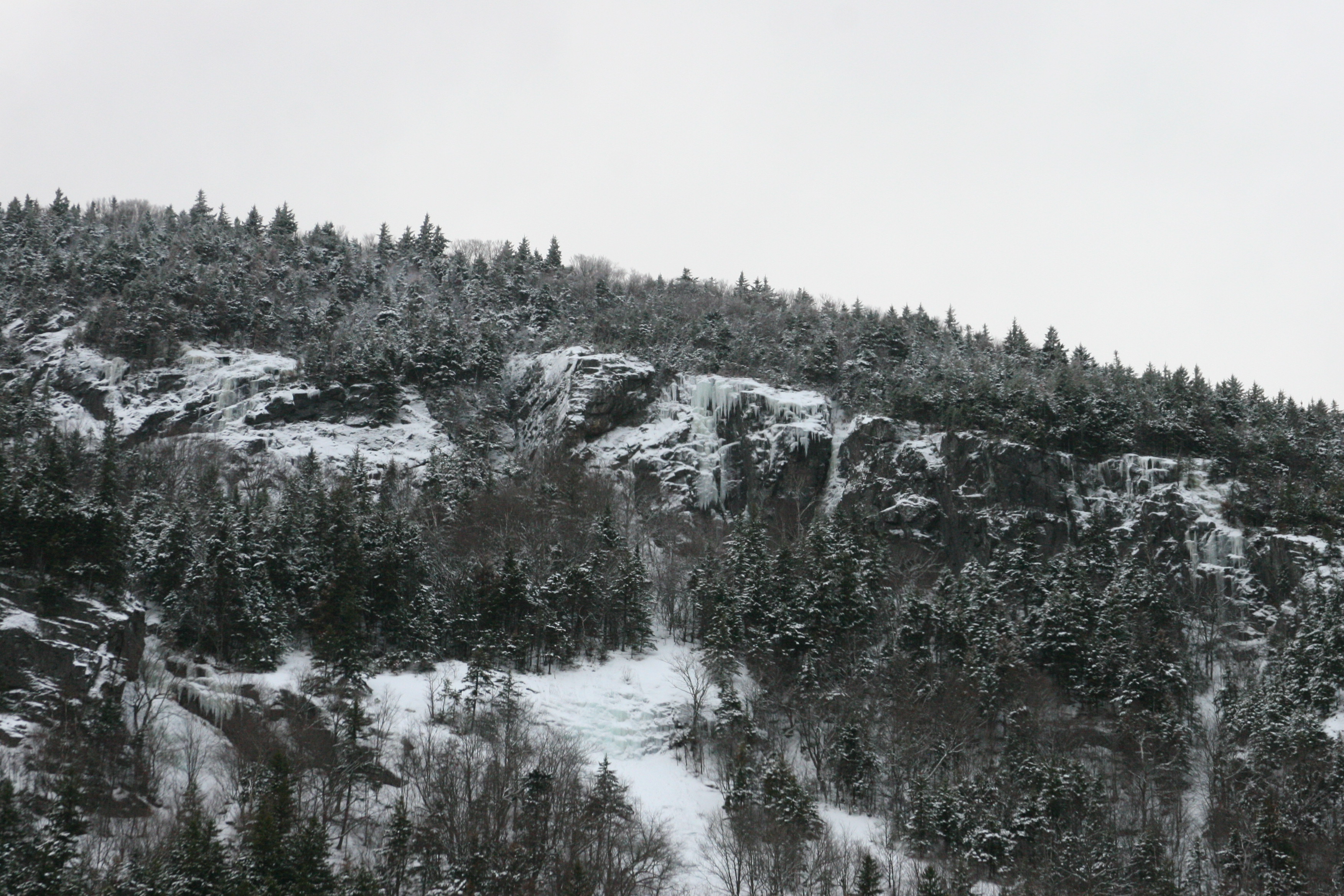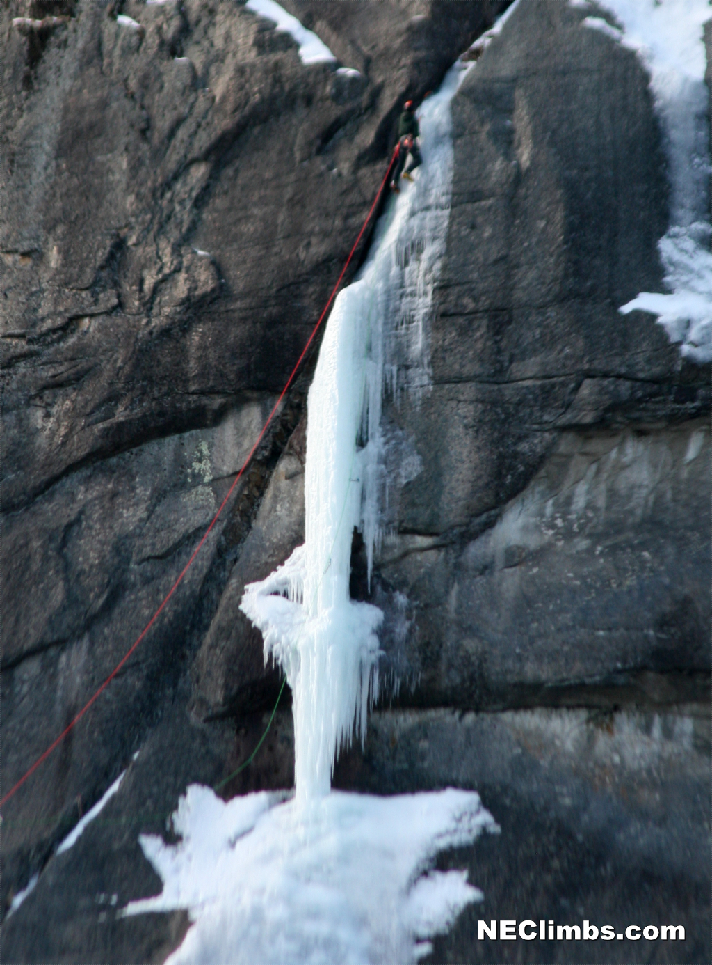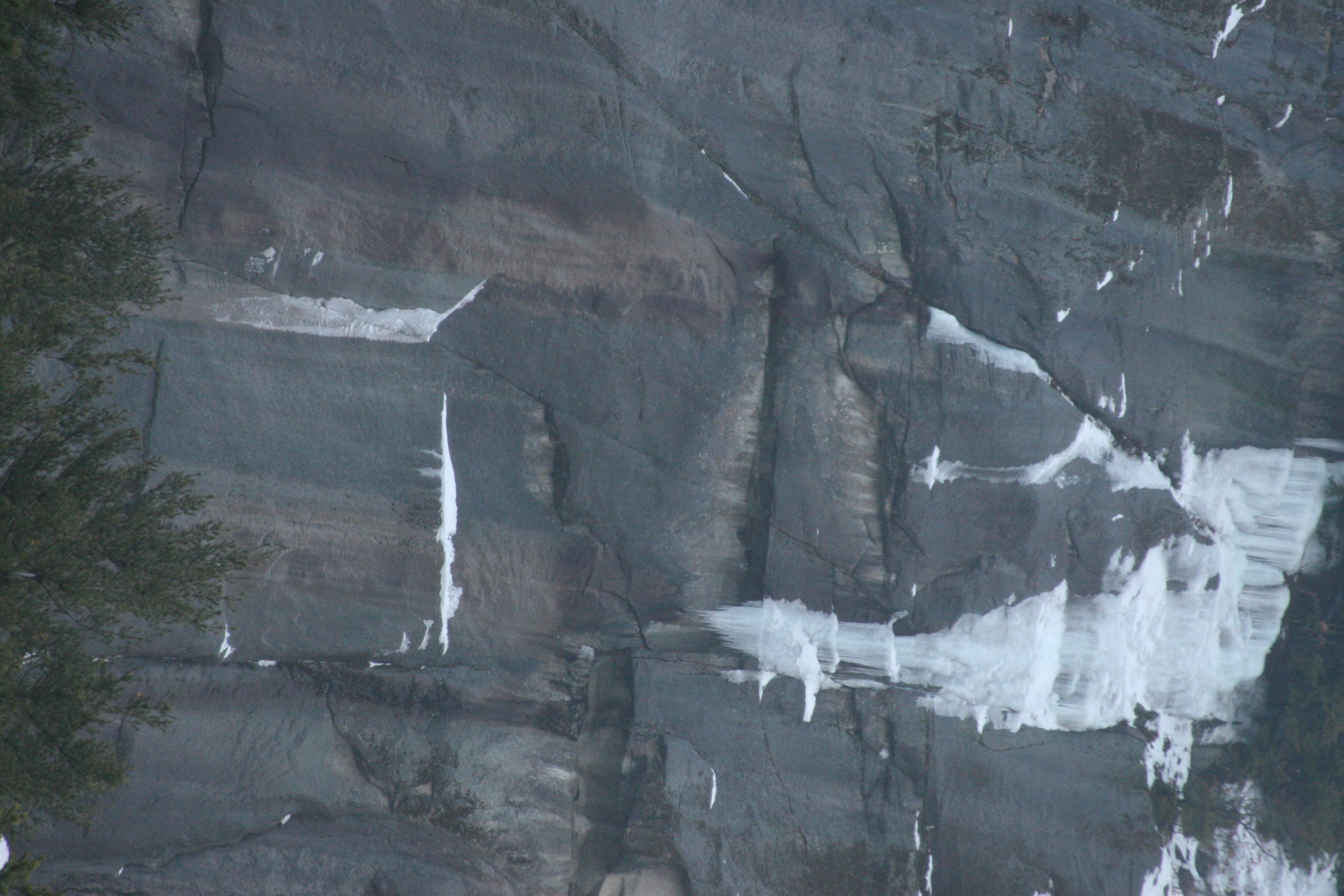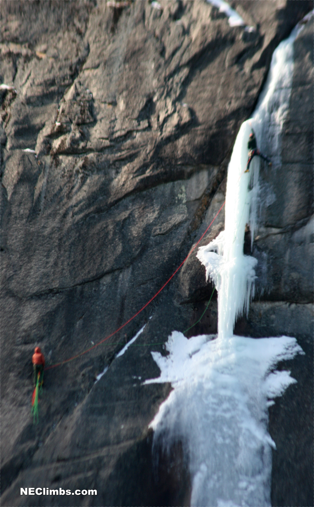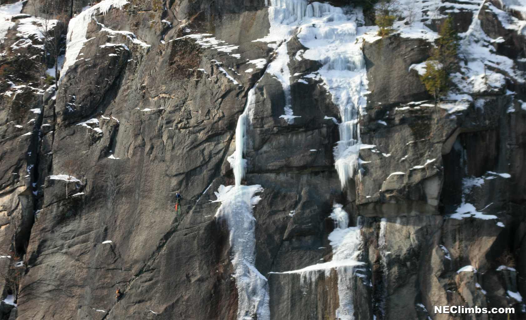 Amazingly enough, through all of this warmth, much of the ice hung in. That is most certainly due to the very cold December. Many things formed fairly well, and even now we had some nights that were cold enough to help rebuild the climbs that were somewhat fat. A good example is Diagonal. The wall was almost clear after the last big rain, but started building again during a cold snap right afterward. Enough that it attracted the attention of Peter Doucette and Ryan Driscoll! I was on my way home from an early gym session Tuesday morning and just noticed that there was someone on the dike! Knowing full well what was going on, I rushed home and grabbed the big camera and took a series of pictures over the next hour.