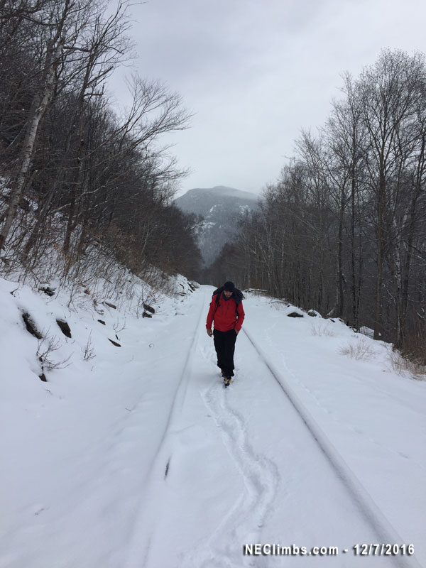 Just as we were pulling out I got a text from Matt Bowman. He was up ate the top of the Notch and send me pix of the Monkey Wrench and lower Hitchcock. Neither looked worth investing the time in, and he said that he and his partner had taken a pass! As we drove up, the fog made it hard to see some of the normal places I check out, like Texaco. I could barely make out the amphitheater and slab, but from what I could see it didn't look good. Tho not as dry as last week, Fang was bereft of ice as well. We stopped at all my normal viewing spots on the way to the top of the Notch and the only place that looked as if it had any ice to speak of was Standard Route. We turned around at the to pos the Notch and drove back to the Arethusa parking lot, figuring we would take the tools for walk down the tracks, just to check things out.