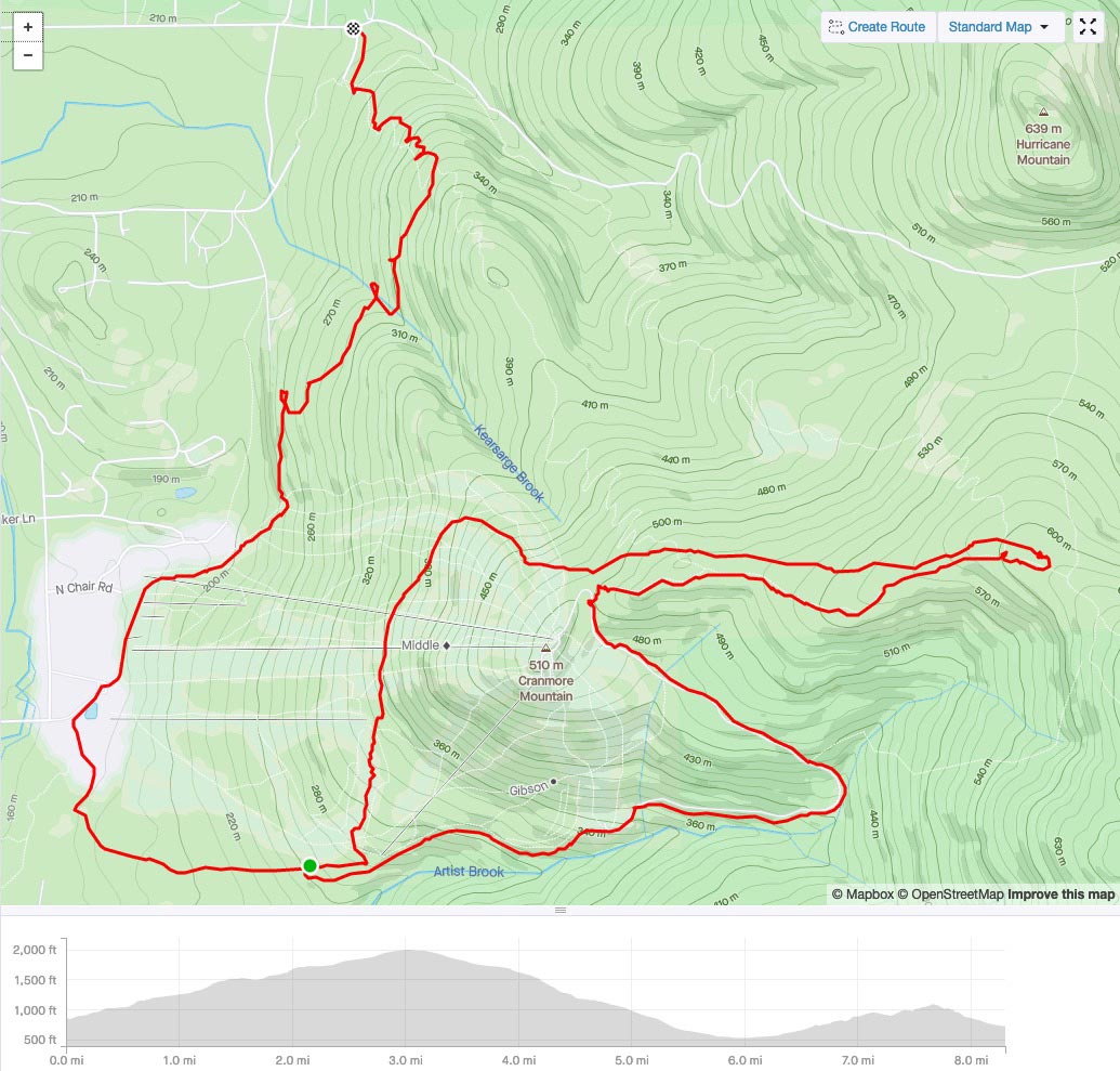 A few days ago I repeated the big ride I'd done last week with my buddy Phil. This time we started at the base of Hurricane Mt Road, cut through the woods into the condos left of Cranmore, road across the base of Cranmore, up the maintenance road on the far right, across the Cranmore Connector, left onto the Hurricane trail entrance and stayed left on the new downhill trail. We popped out on the Kandahar ski trail, went down a bit and the angled left all the way back across the middle of Cranmore back to the maintenance road. From there we went back across the base of Cranmore and followed the new machine-built trail that takes you back over to the end of Kettle Ridge and back to the water tower. It's about 10 miles and 2,000' of climbing. Needless to say I was beat. Here's a map...