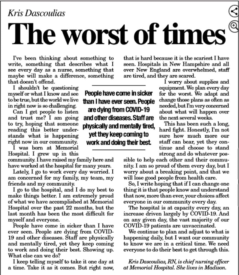I keep saying that things are "not good" but this is a severe understatement. The situation is BAD up here, and frankly not getting better. PLEASE get vaccinated and boosted. And if you are going to come up here and hang out at all, mask up! This NO JOKE friends. Here is an Op Ed from a nurse at Memorial Hospital: